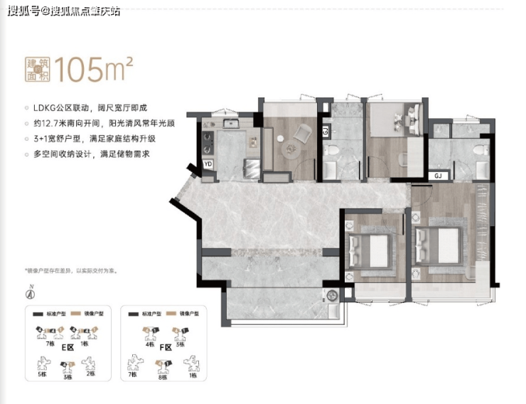 所有户型均为三开间朝南,180度全面向阳,建筑面积约89㎡/105㎡更有超大面宽阳台。