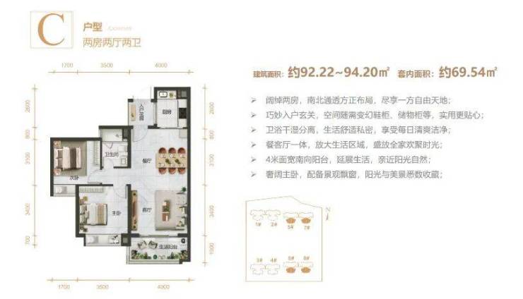 精心设计建面约92-102㎡两房至三房,两梯四户,保障业主私密性;南北通透方正布局,采光通风好,功能分区合理;阔绰餐客厅从容待客,大面宽阳台户户赏景,品质精装,礼遇美好生活。