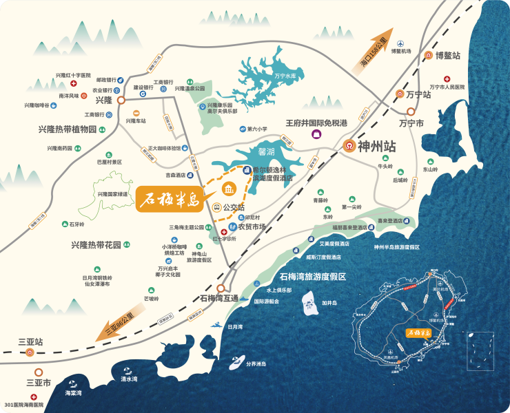石梅半岛位于兴梅大道东侧,交通四通八达,距离博鳌机场约60公里,三亚机场约113公里,海口机场约170公里;距神州站约8.9公里,距万宁站约23公里,G98石梅、莲花双出口接入海南环岛高速,6路公交车直达万宁市区、兴隆镇区、周边各大旅游景区。