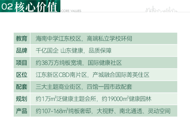 作为省属国企山东健康集团力作,项目雄踞江东新区 CBD 南芯,总占地 253 亩,以容积率 3.03、 、绿化率 35.1% 的低密规划,打造全龄健康社区范本。承袭 “六位一体” 健康体系,融合太阳能、雨水回收等绿色技术,筑就 7 - 17 层精工洋房与小高层,户户享全明通透格局。