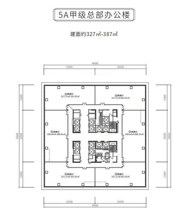 约187米高迎宾路首排地标,约4.4米标准层高,约13.5米全挑空无柱化大堂,16部鼎配电梯,建面约327-387㎡产品。