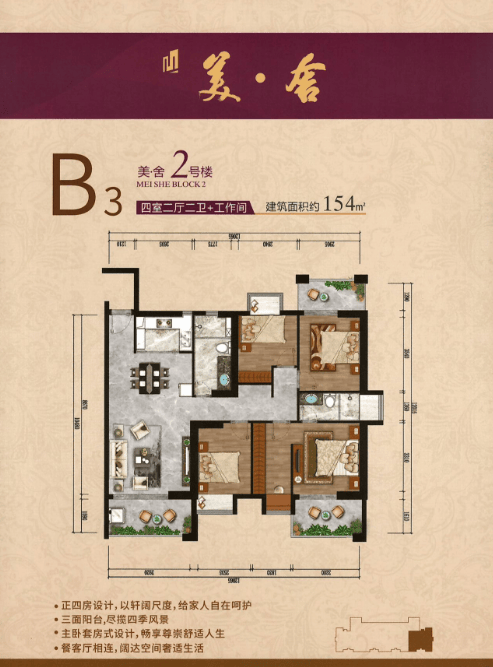 B3户型 四室二厅二卫+工作间+三阳台
