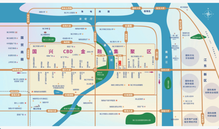 3.经济金融中心:国兴大道大英山CBD片区坐拥政府颁布的“五公里金融街”,银行总部、证券、基金、保险等区域总部均坐落于此,是海南首屈一指的经济中心。