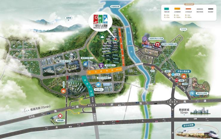 三亚东方太阳城·山河苑项目,西卧山顶公园,东拥三亚河(槟榔河),近享水源池水库、荔枝岭生态景观,面朝三亚主城区、三亚湾等,以山河为靠,以繁华为景,打造天赋上境栖居地。