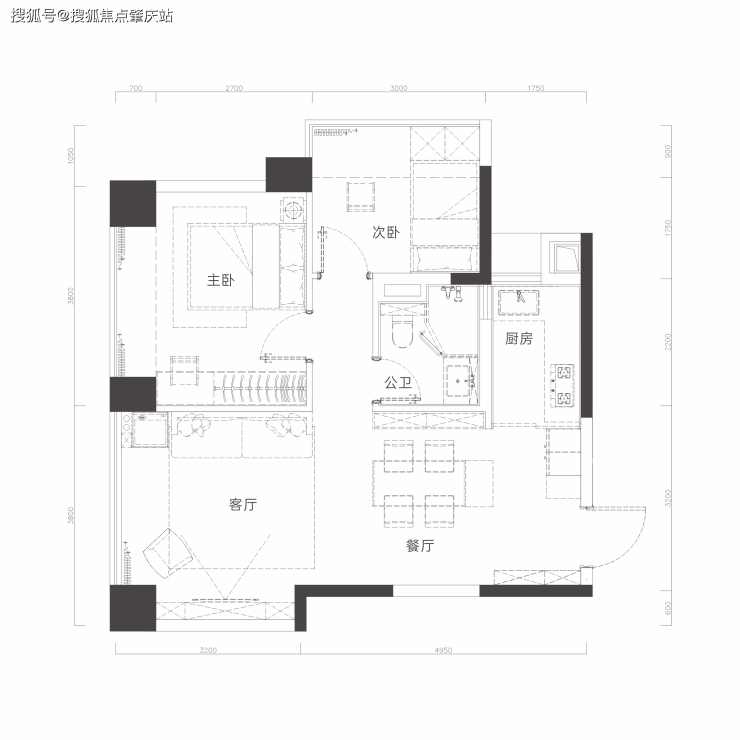 玄关入户,便捷收纳;约3.35米面宽客厅,约8米进深,客餐厅一体化;前沿S墙设计,预留冰箱位,空间零浪费;约3.8米面宽大主卧待飘窗