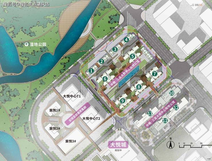 一期:占地 31 亩,建筑面积约 15 万㎡,由大悦中心 T1、T2 写字楼,宸悦 1#、2#、3# 五栋办公楼及底层潮悦里商街组成。