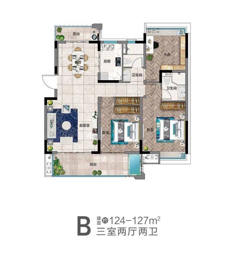 B户型亮点:全能三房,户型方正,宽景阳台规划温泉泡池