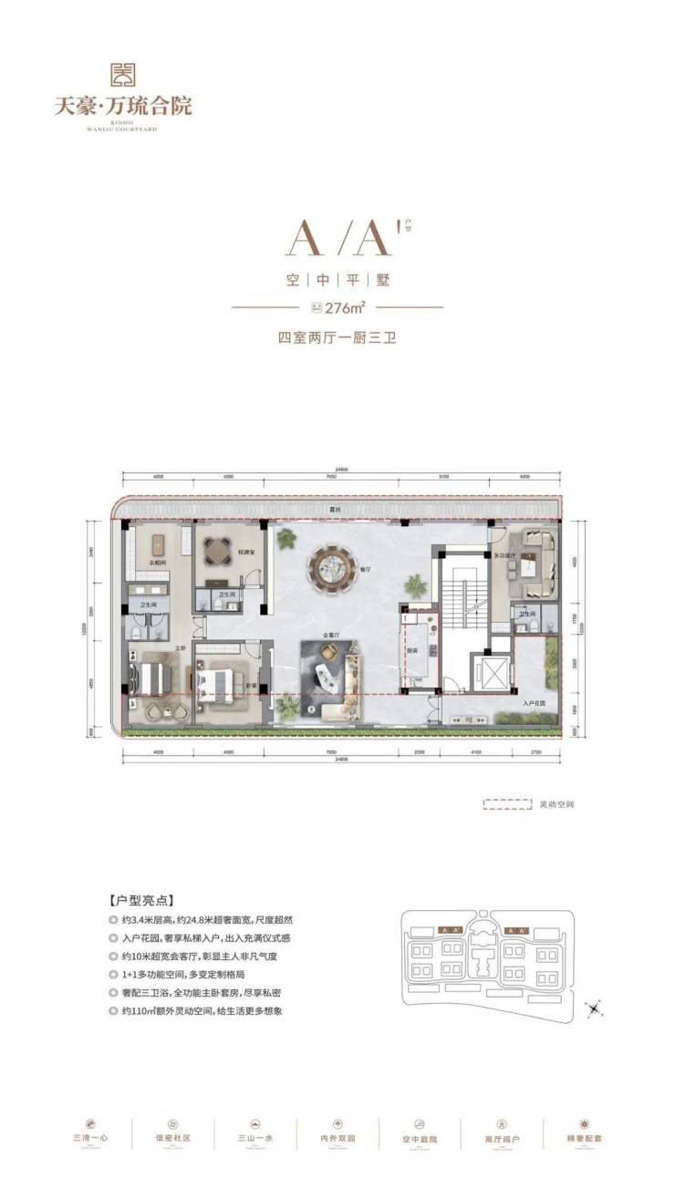 产品户型:建面约230-246㎡花园式合院,建面约276㎡空中平墅