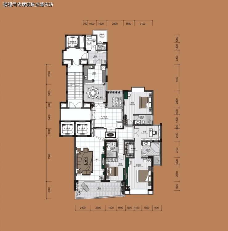 C户型:建面约297.67㎡、四房两厅五卫+工人房+超大入户花园(豪装)