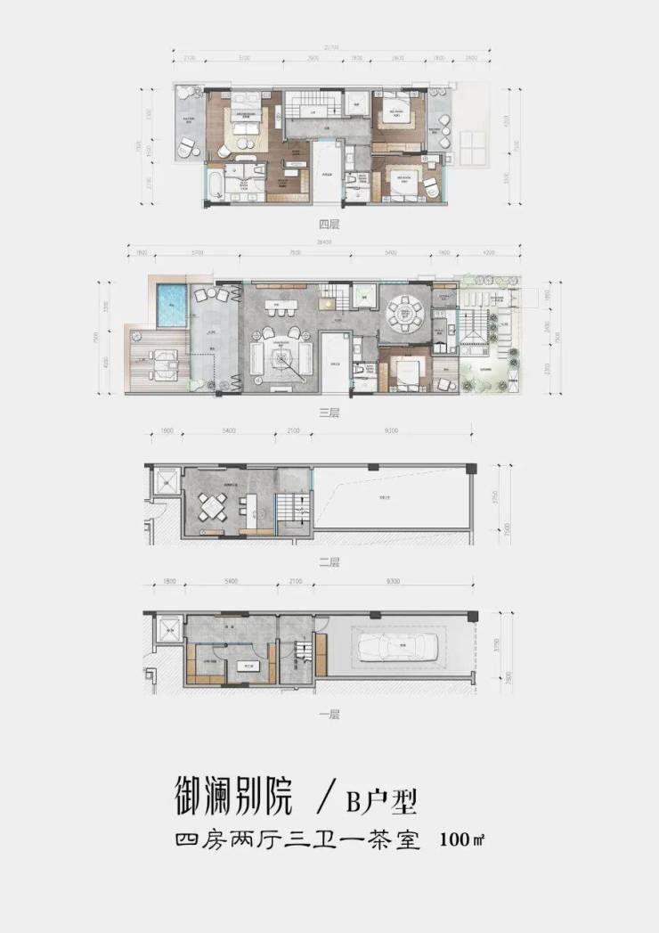 ②建面100平米,实得约340平米,四房三厅四卫一艺术室一多功能房