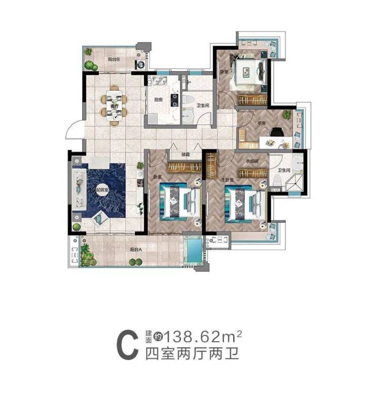C户型亮点:金牌四房,奢华空间,宽景阳台规划温泉泡池
