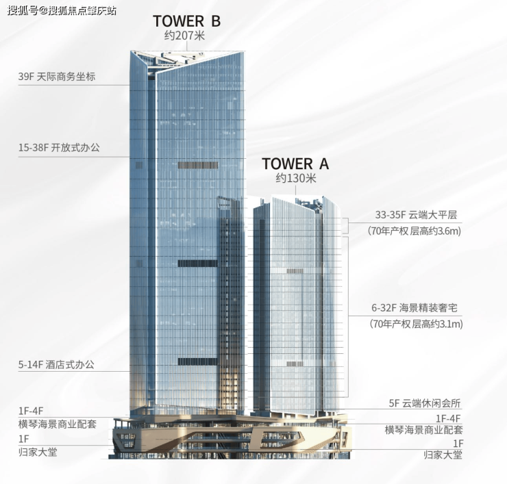 ▷项目产品:总高共35层,裙楼商业( 1-4 层);架空层泛会所(5 层)