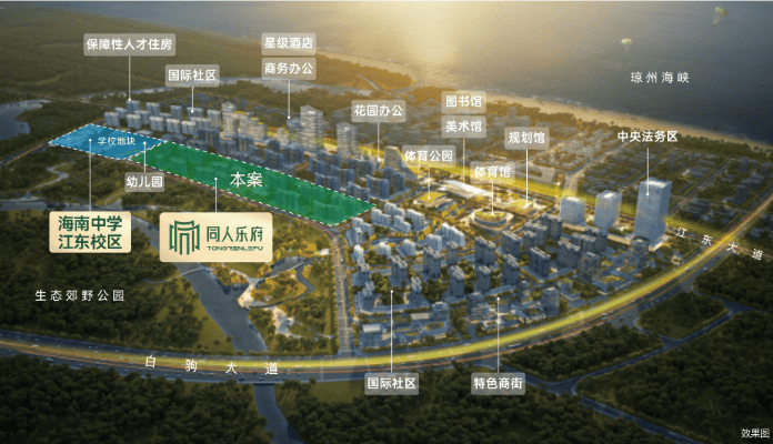 1. 核心区位:地处海口江东新区 CBD 南片区,该区域作为海南自贸港集中展示区,汇聚了多家世界 500 强企业,区域发展潜力巨大。项目与海南中学江东校区仅一路之隔,是学校 2 公里范围内的唯一住宅新项目,教育优势极为突出。