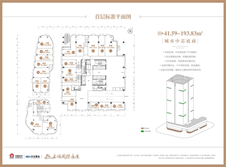 【楼栋概况】楼体高度110米,地下二层地上22层,1-4层为城市中芯底商,首层层高约6米、2层层高约为4.5米、3/4层层高约为4.35米;5至18层为国际商务空间,层高约为4.2米。