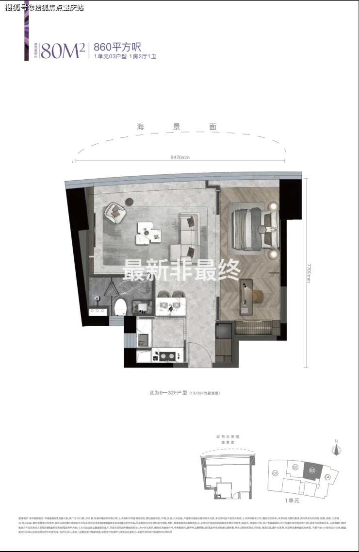 1房2厅1卫,超8米绝版景观面,看一线海景、澳门景,户型方正实用,配有明火厨房