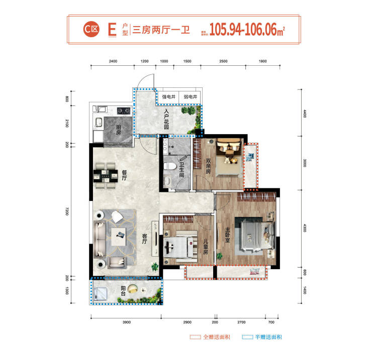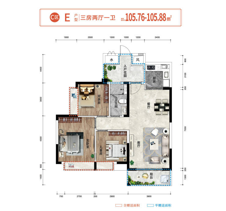 🏖𝐅户型约𝟭𝟬4㎡(三房两厅一卫)