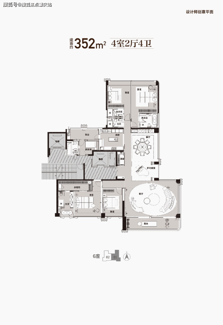 6座01户型 建面约352㎡|东南单边无遮挡,三面采光全景视野,三梯两户尊贵归家仪式