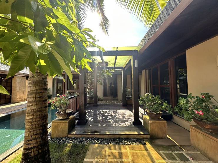庭院西部双卧室对称而立,配套卫生间与室外淋浴间,尽赏超大泳池景观,起居室与餐厅、家庭室浑然一体,共赏中心庭院水木清华,四季芳菲愉悦身心。设保姆间、洗衣间、卫生间与中式厨房,主仆区域分明,大家风范可见一斑。