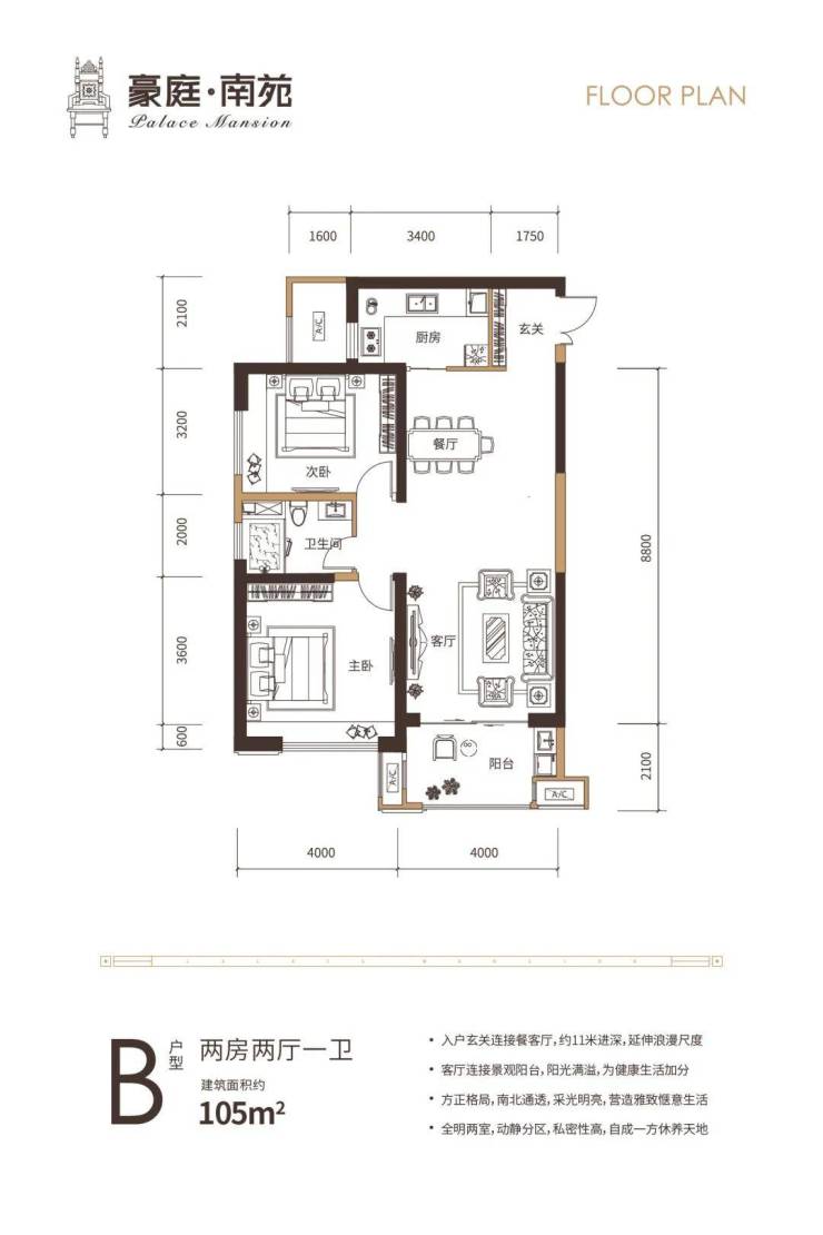A、B户型为建面105平的2房刚需户型,全明空间,建面约8㎡的大阳台,朝南,极大满足生活需求;面积相对较小,总价较低,是年轻人置业的首选。