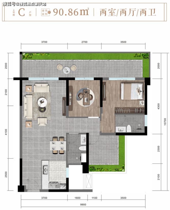 6#楼C户型约93㎡舒阔两房两厅两卫
