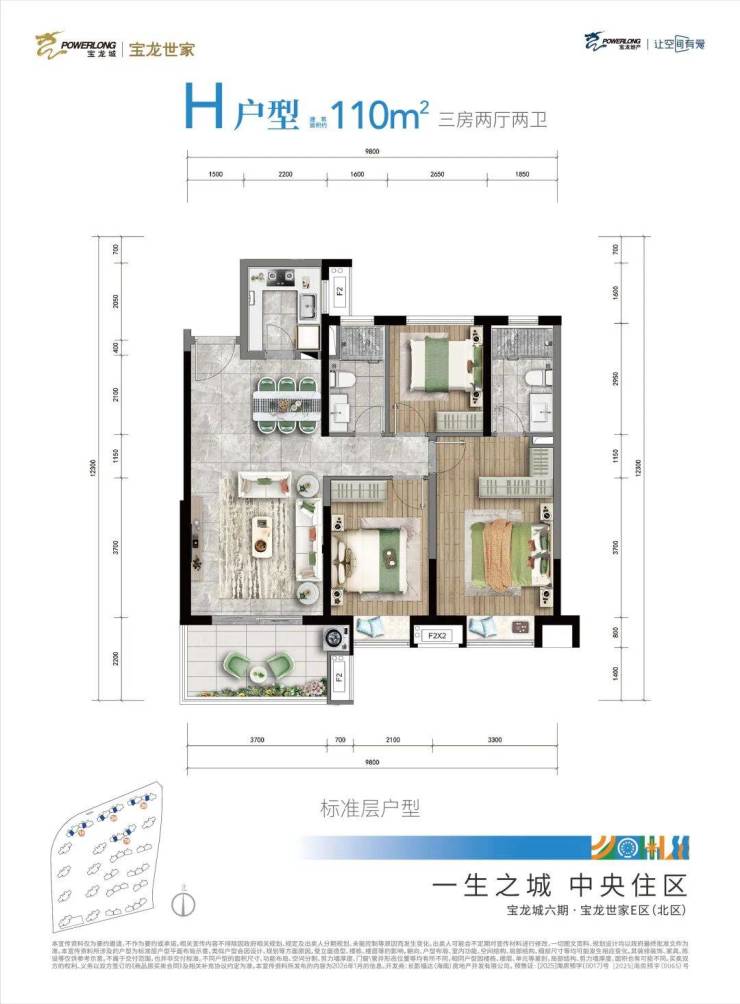 🌟H户型——建面约110㎡三房两厅两卫通透板楼 三开间朝南 舒阔三居 方正格局约3.7x2.2m阔尺阳台 视野开阔动静分区 干湿分离 全明厨卫 双卧室带飘窗 主卧套房 阳光长者房