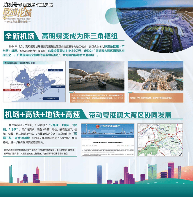 欧浦花城占据空港经济区域,珠三角枢纽机场选址高明,作为广东省重点打造的“5+4”骨干机场之一,总投资额高达419.39亿元, 将建设120万平方米航站楼,建面与广州白云机场看齐, 满足年旅客吞吐量6000-8000万人次、年货邮吞吐量220万吨。这使得高明成为粤港澳大湾区发展的新焦点,为欧浦花城带来了无限的发展潜力。