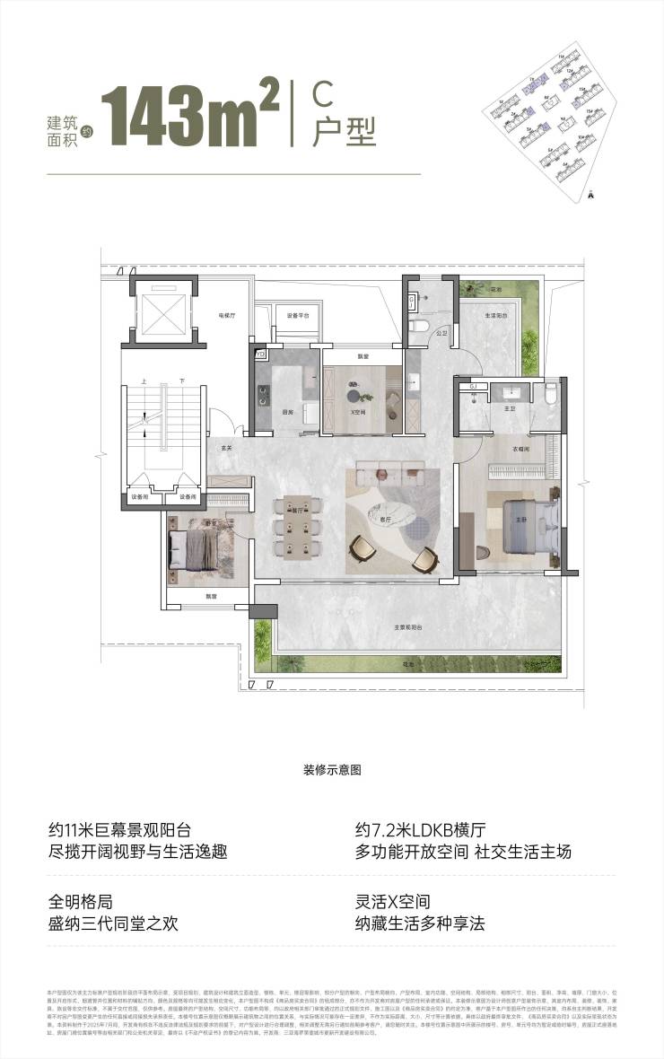 本宣传资料所涉及的⼾型仅供⽰意参考,其装修、家具、陈设等⾮交付标准,不属于交付范围。不同⼾型的⾯积尺⼨,功能布局,空间分割、⻔窗/管井形态位置等均有不同;相同⼾型因楼栋、楼层、单元等差别,局部结构、⾯积等也可能不同,具体以双⽅签订的商品房买卖合同约定为准。