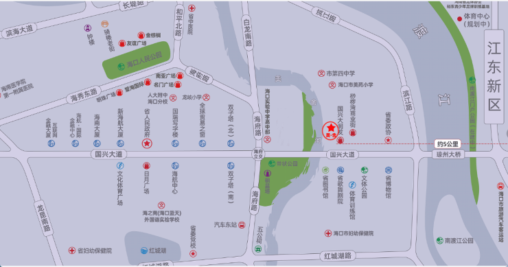 3.经济金融中心:国兴大道大英山CBD片区坐拥政府颁布的“五公里金融街”,银行总部、证券、基金、保险等区域总部均坐落于此,是海南首屈一指的经济中心。