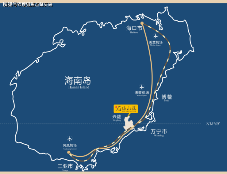 3大机场:海口美兰机场(约140公里) 、三亚凤凰机场(约98公里) ,琼海博鳌机场(约54公里)