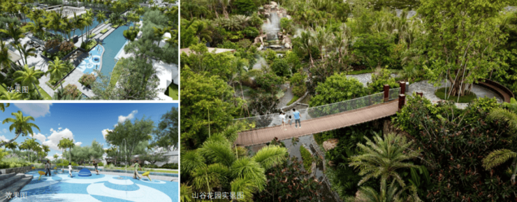 一二期交汇处,引水系为景观轴打造山谷花园,10米高差瀑布,吊桥、栈道、溪水等,营造和谐自然的活力休闲区。