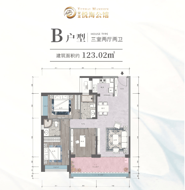 B户型 建面约123.02㎡,三房两厅两卫