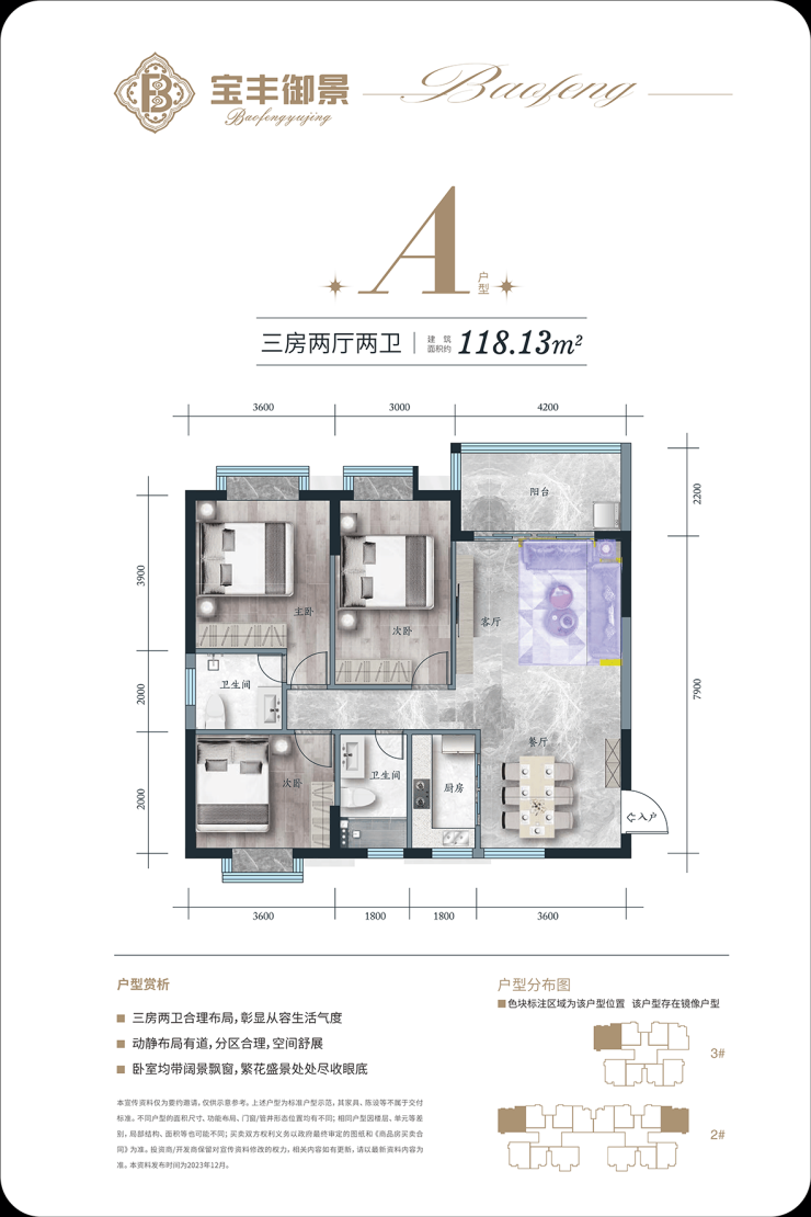 A户型 三房二厅两卫一阳台