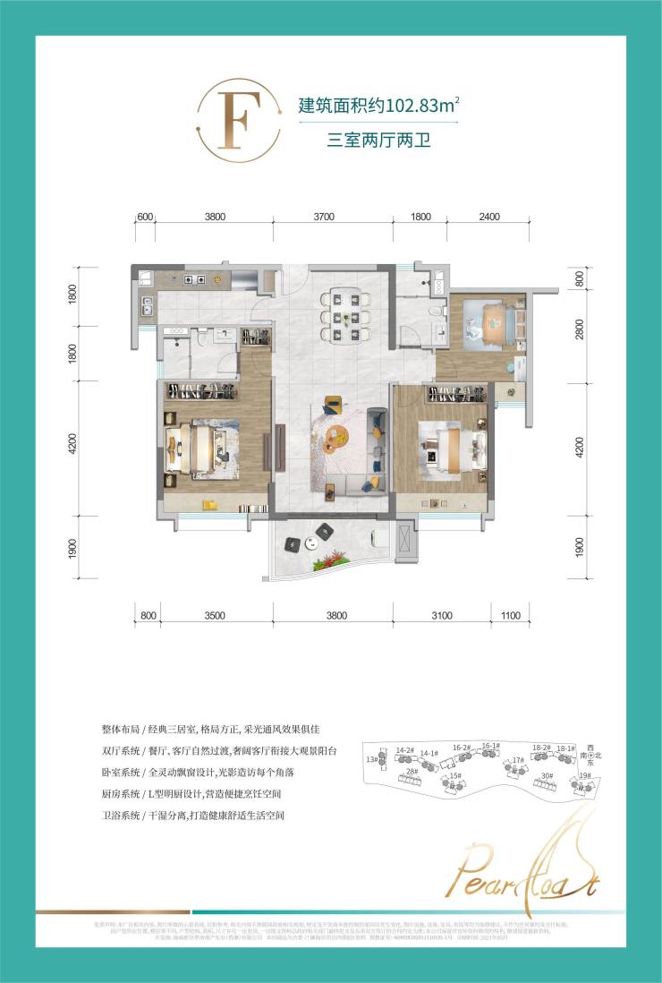 F户型-建筑面积约102㎡ 三室两厅两卫:餐客厅一体化,L型明厨设计