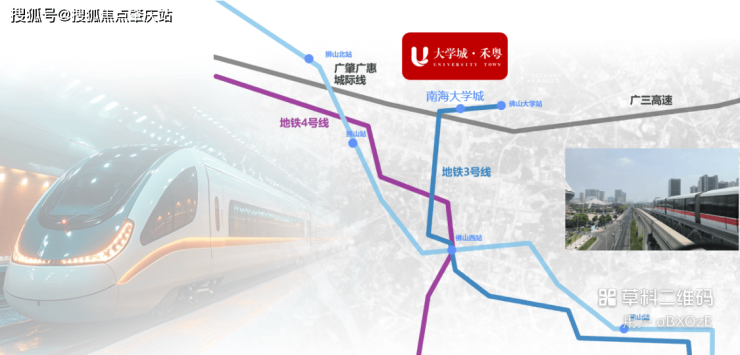 双地铁,佛山3号线(南海大学城站),佛山4号线(在建科技西路站) 15分钟经佛山一环通达佛山机场及佛山西站:机场+高铁,快速通达粤港澳甚至全国 30分钟快速通达广佛各区: