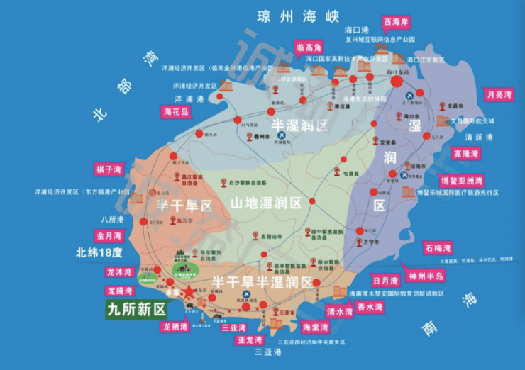 像海口、临高、儋州、东方、文昌、琼海、定安、屯昌、万宁、琼中等地都属于岭北区域,冬季寒冷湿润,夏季高温多雨,四季分明。而乐东、三亚、陵水位于北纬18度以内,属于岭南区域,夏无酷暑,冬无严寒,阳光充足,气候适中,非常适合居住。众所周知北纬18度这个纬度圈穿越了多个著名的旅游度假胜地,如夏威夷、马尔代夫、巴厘岛、墨西哥城等地,因此被称为旅游度假的“黄金纬度”。九所新区属于热带季风气候,冬季温暖干燥,适合避寒。这种气候吸引了大量候鸟老人前来过冬,使得九所新区成为东北人喜欢的避寒胜地。此外,九所新区还有丰富的自然景观和旅游资源,如尖峰岭国家森林公园和天涯海角、南山、大小洞天等著名景点。