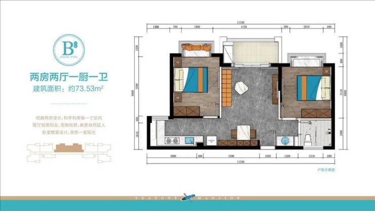 B户型:建面约73.53㎡,两房两厅一厨一卫