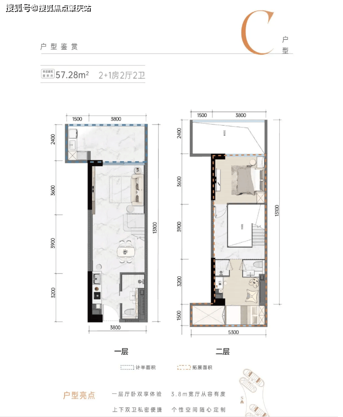 51 - 57㎡2 + 1 房 2 卫户型:在保证功能齐全的同时,各空间尺度更为舒适,客厅和卧室的面积更大,居住体验感更佳。