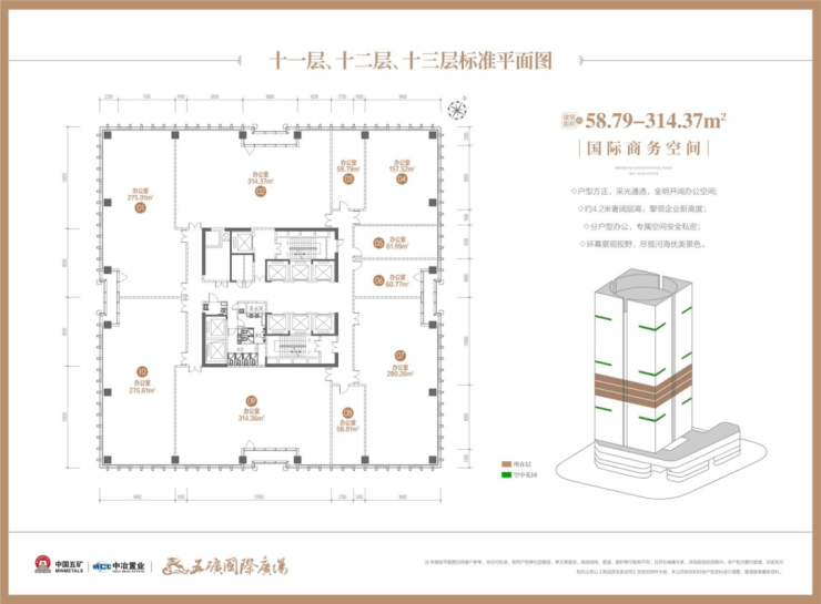【楼栋概况】楼体高度110米,地下二层地上22层,1-4层为城市中芯底商,首层层高约6米、2层层高约为4.5米、3/4层层高约为4.35米;5至18层为国际商务空间,层高约为4.2米。