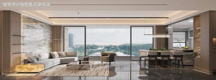 ②打破物理空间界限形成更开阔的整体,玄关、餐客厅、厨房、阳台无视线阻隔,美学与功能融会贯通。③窗外山湖海园风景气韵自然流淌进室内,亲情互动无隔阂,盛载大家庭的欢聚时光。