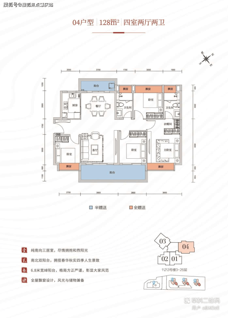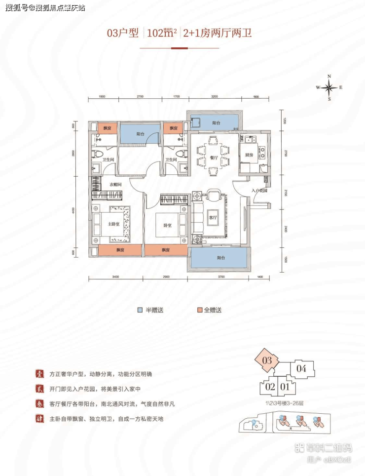 高拓展N+1户型,同样的面积,多一房空间 房型方正,客餐厅合理布局,整屋分而不离 南北通透,全明户型,四时有光,推窗即景 三室朝南,大横厅设计,连接超大景观阳台 私密主卧独立卫浴,设瞰景飘窗,大面宽采光