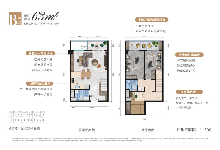 建筑面积约63㎡5.6米奢阔层高LOFT,户型方正,买一层送一层,大三亚北纬18°无界全能低密社区,实景现房,即买即住。