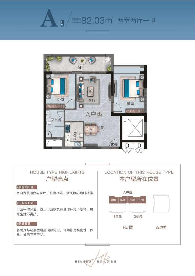 户型:A户型:82.03㎡ 两房两厅一厨一卫