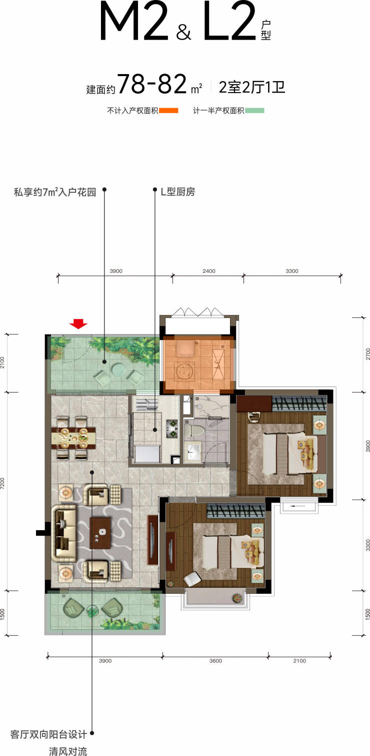 M2&L2户型 建面约78-82㎡2室2厅2卫