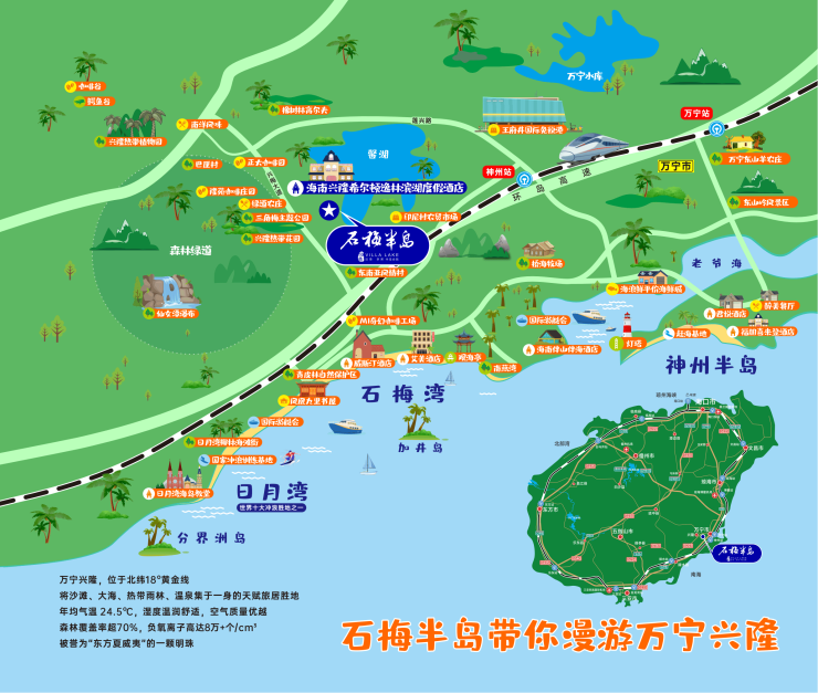 石梅半岛坐拥海南东海岸石梅湾、日月湾、神州半岛三大旅游度假区,外享高端旅游资源配套,包括星级酒店、高尔夫球场、国家森林绿道、兴隆热带花园、王府井免税港等,自然与人文交融,满足你对海南定居的所有想象。