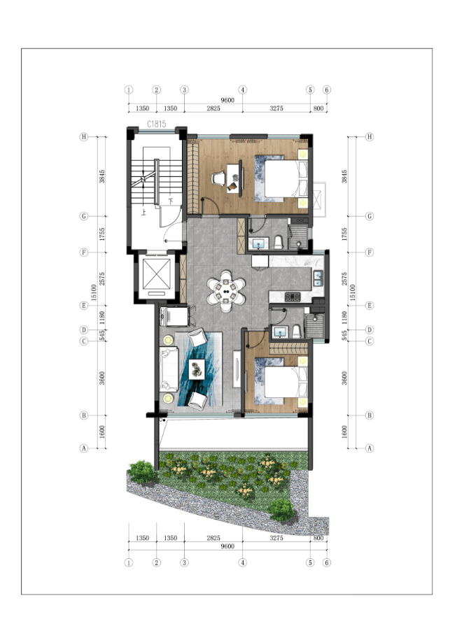 3.下叠:建筑面积约100-110㎡,四房三厅三卫。