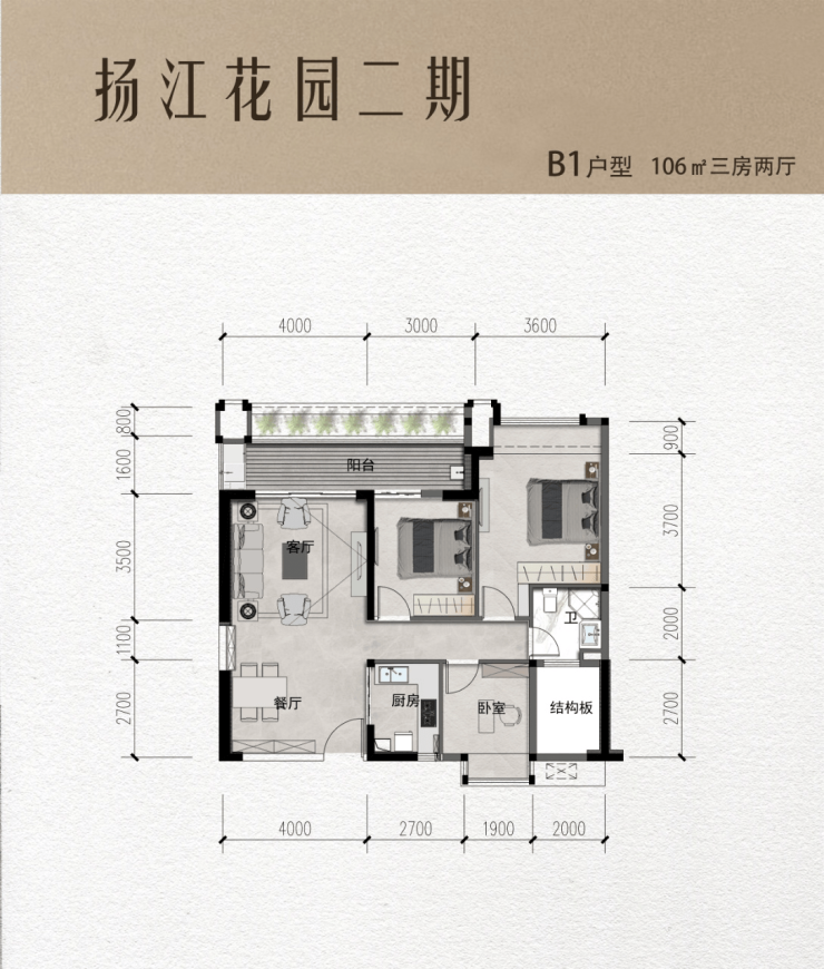 106㎡三房(阳台半赠送,飘窗花池结构板全赠送)
